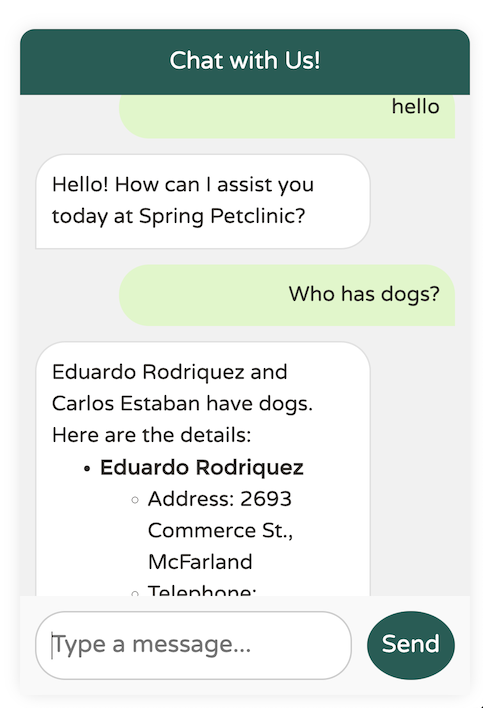 Spring Petclinic integrates a Chatbot that allows you to interact with the application in a natural language. Here are some examples of what you could ask: